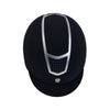 La calotta esterna è in velluto con prese d’aria frontali decorate da profili di vario colore e targhetta con logo Equestro.