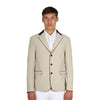 Giacca uomo da concorso, tre bottoni, in tessuto tecnico traspirante e ultra leggero di ottima qualità. Colletto in camoscio, fodera interna, tasche a soffietto e patch con logo Equestro sulla spalla.
