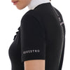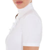 Polo da donna slim fit a maniche corte, realizzata in tessuto tecnico elasticizzato e traspirante, perfetta per garantire comfort e prestazioni ottimali anche nelle giornate più calde. Le sue proprietà traspiranti favoriscono una ventilazione efficace, mantenendo la pelle fresca e la temperatura corporea ideale durante le attività sportive o le competizioni. Questo capo è dotato di una chiusura a zip impreziosita con ruches e strass e un elegante colletto logato Equestro che aggiunge un tocco distintivo. Il taglio femminile segue armoniosamente le linee del corpo, valorizzando la silhouette grazie a un design che si stringe delicatamente in vita. Il design del capo dona un'eleganza ricercata e un tocco di originalità.